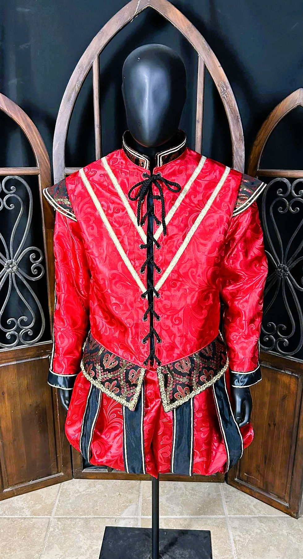 We are pleased to offer this one-of-a-kind Cavalier Suit, in eye-catching red satin brocade!Perfect for fantasy masquerade balls, historically-themed events, weddings, SCA/Larp, Carnival/Mardi Gras, Theater/Film Productions, Shakespeare in the Park and more.